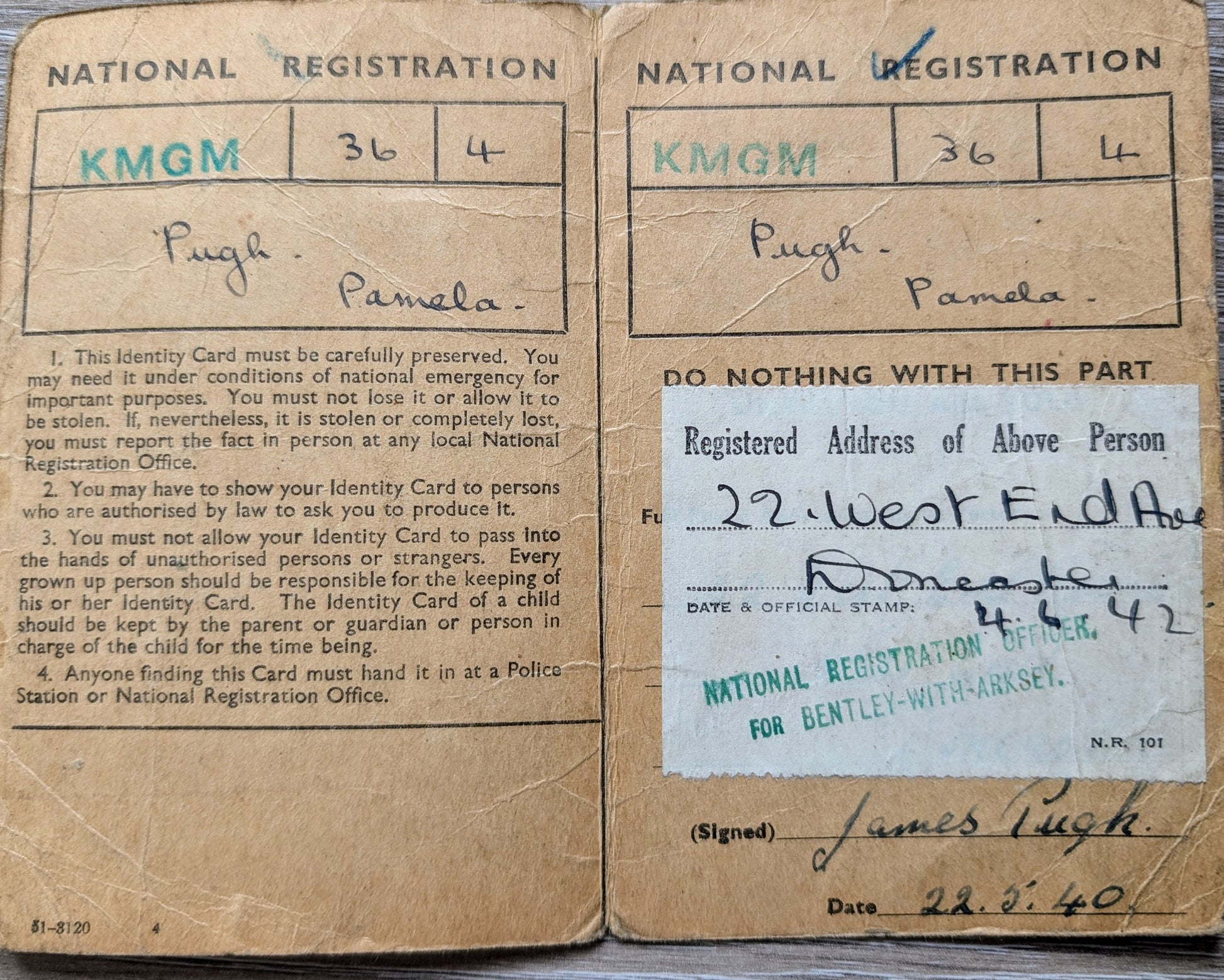 National Registration identity card for Pamela Pugh signed by her father James Pugh the ARP warden,