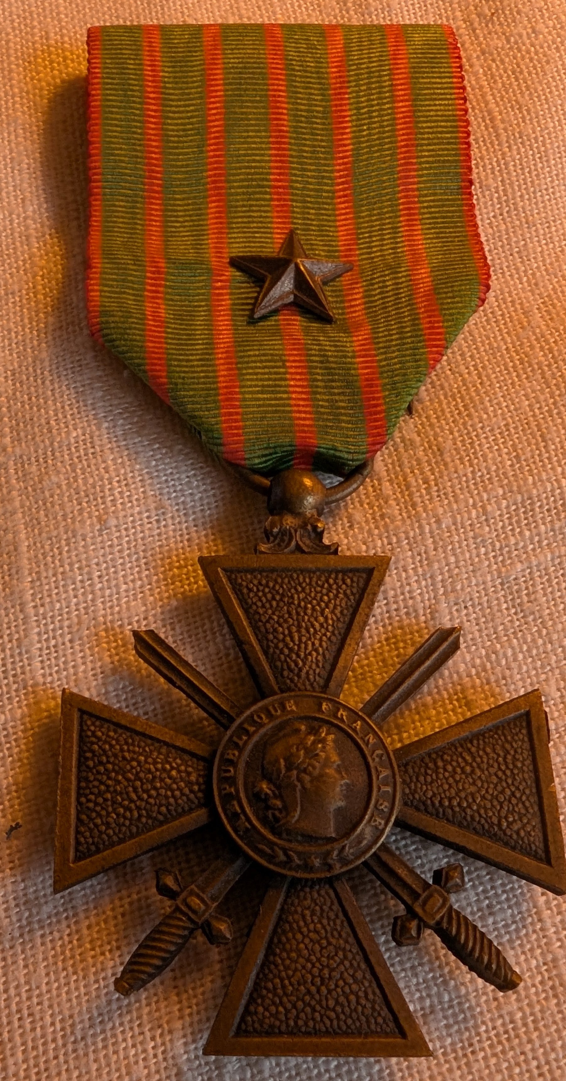 This is an original wartime French Croix De Guerre medal with a bronze star on the ribbon.